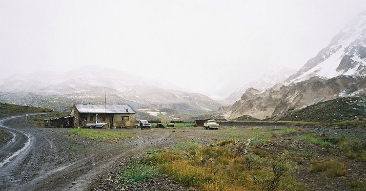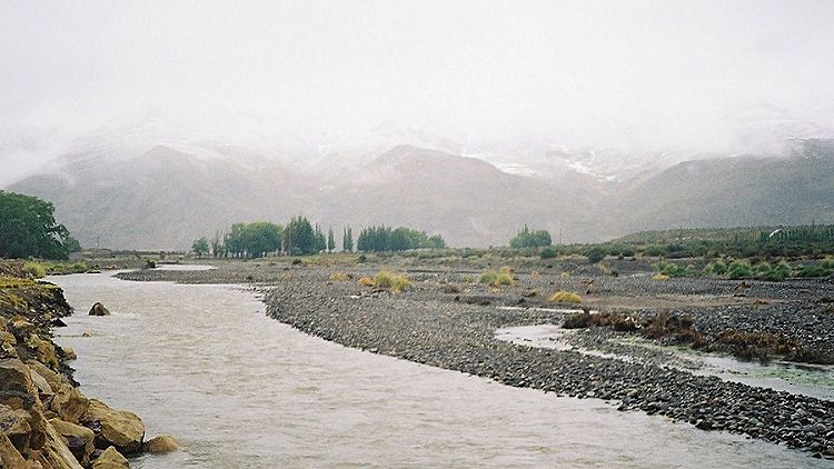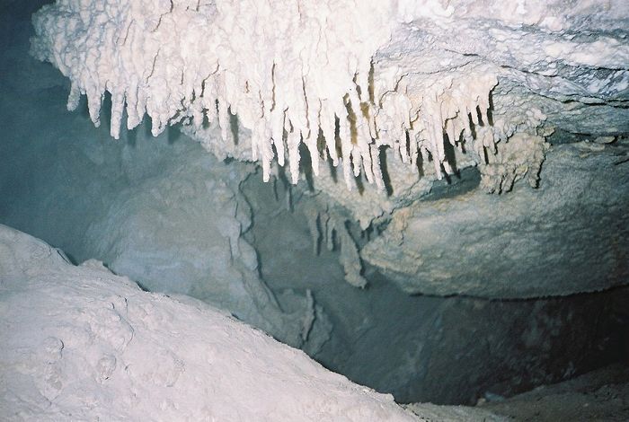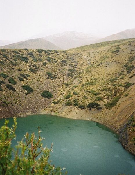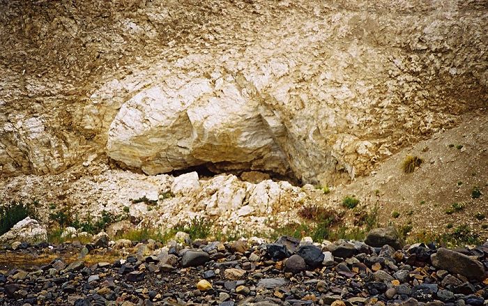 (click on images to enlarge) Las LeñasThe gypsum can be accessed again further to the north near to the ski resort of Las Leñas. The area is notable for some hot springs and the Pozo de Las Animas. The latter are two large water-filled holes in the lateral moraine of the Rio Salado valley. Due to the atrocious weather we virtually did not leave the car but did note one cave by the roadside. The road was poor so we did not drive much beyond the resort. With hindsight I think this area would be worth further investigation.