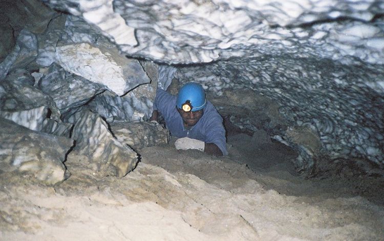 (click on images to enlarge) Cueva del TigréThis was the only lava tube that we visited this year. The cave is used as a wild show cave due to its close proximity to the road and easy walking sized passage. Our interest in the cave was to see if we could follow the huge draft at the end. Four hours were spent digging out a sand-filled tube. Digging conditions were horrendous. The basalt was extremely sharp and the visibility was virtually zero as we stirred up huge clouds of dust. Fortunately we had come equipped with a bag of dust masks. Excellent progress was made but we were unable to break through. The dig ended under an area of boulders with airspace and a howling draft. More passage here is a certainty! Above ground we headed off across the featureless lava plain to see if we could find another entrance. After a couple of hours under the blazing sunshine we called it a day. On a previous day we had driven around looking for a cave that a local farmer had spotted. As is always the way with these things the location description didn't fit the topography. But bearing in mind the huge expanse of basalt in the area related to the El Payan volcano, there are undoubtedly more lava tubes to be found.