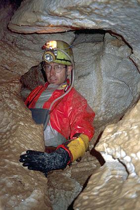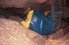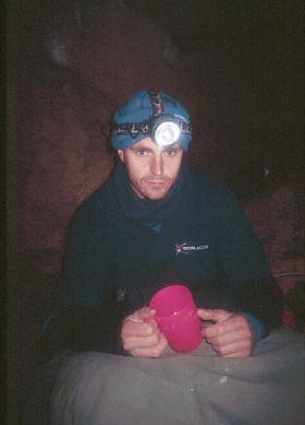 It took about 4hrs to reach camp, which is located on the only flat bit of ground in the cave. A small area of rocks behind a huge boulder had been levelled off in a chamber called the Hall of the Mountain Numpty. It was quite a home from home. As soon as we arrived at camp we came across the detritus of previous residents. Whilst clearing up and looking for something to dump the rubbish in I looked rather too closely at an innocent looking BDH. We soon had everything washed up and had a meal on the go just as the culprits, Lev and Rich, came back from a pushing trip. A delightful supper for 4 was created and so to bed. Well almost except for when Joel managed to roll a large rock onto Lev's leg - it took three of us to lift it off him. Fortunately he only had bruising but Joel cut his hand in the rescue attempt. Tim Francis back to index of foreign trips