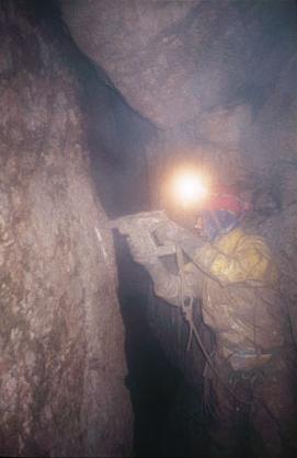 Dachstein, Austria 2000G5 EisturnenhöhleMy introductory trip down G5 was a portering session down as far as we wanted to go. So Tangent and Peter Hübner and myself were to carry a load of kit down to Insane Worms and Gheckos. Peter was carrying a monster sized "Hirlatz" bag, which somehow managed to make its way all the way down to the camp despite its size. He called it a day in the entrance series leaving Tangent "The Mendip Numpty" and myself to carry on without him. This trip proved to be a relatively straightforward carry despite the strange canvas bag, nicknamed "The Slug" and normally resident at the Belfry, that I was portering the kit in. The highlight of the trip turned out to be the dramatic thunderstorm that chased us back to the Wiesberghaus.